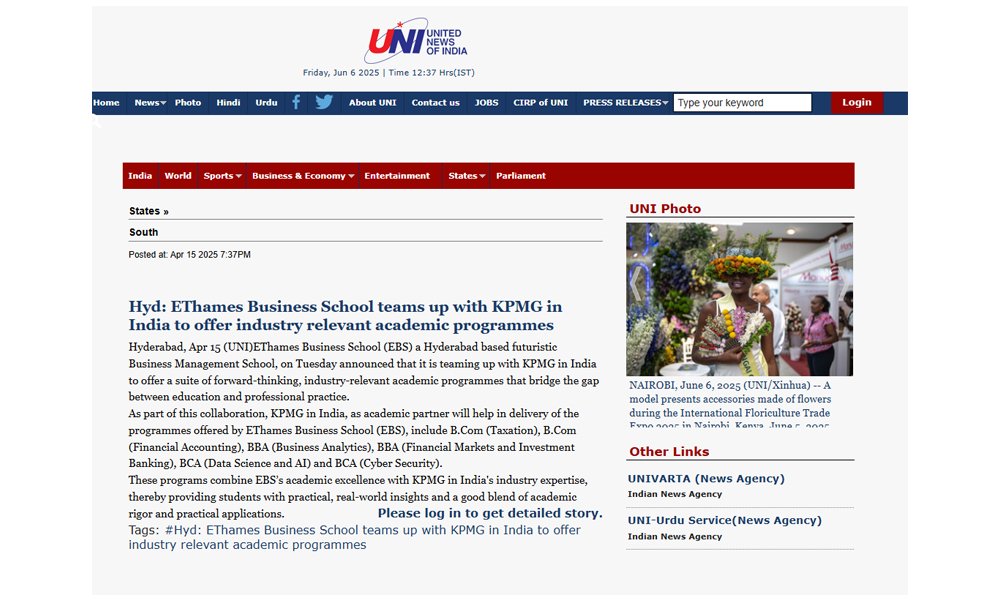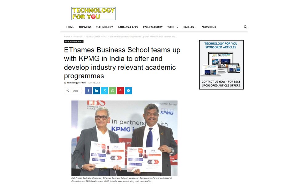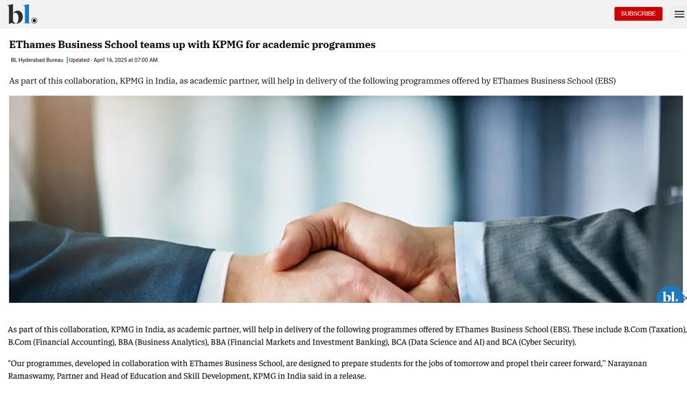 EThames Business School has partnered with KPMG in India to co-deliver cutting-edge undergraduate programs in B.Com, BBA, and BCA, blending academic rigor with industry insights in fields like Taxation, Business Analytics, Cybersecurity, and AI.